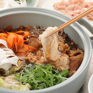 大根、にんじん、えのきだけ、ベーコンを入れ、しんなりするまで少し煮る。レタス、水菜、豚肉はさっと茹でる。