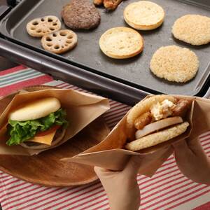 鉄板を弱めの中火に加熱し、油を薄くのばす。温まったら成形したパテ、ライスバンズ、水気をよく切ったれんこんを並べて焼く。