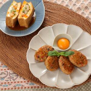 厚揚げを2等分にし、真ん中に切り込みを入れてポケットを作っておく。長ねぎ、パクチーを粗みじん切りにする。