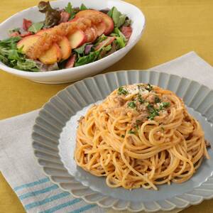 スパゲッティが茹で上がる少し前に混ぜておいた【B】をフライパンに入れて全体を混ぜる。