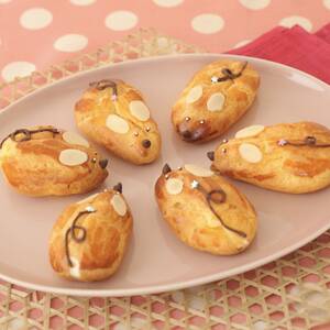 余ったチーズクリームを使って、アーモンドスライスをねずみの耳に見立てて貼り付ける。