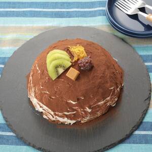 <20>にココアパウダーをかけ、中身と同じ位置にトッピングをして完成。