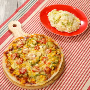 切りもちは5mm幅に切り、ベーコンは1cm幅に切る。玉ねぎは縦に薄切り、ソーセージ、ミニトマト、ピーマンは輪切りにする。