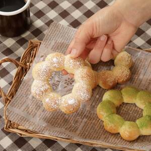 3等分にして、手にサラダ油をつけながら7~8個にわけて一口大に丸め、オーブンシートの上にリング状にのせる。