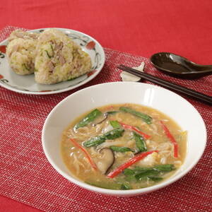 ごはんをボウルに入れ、キャベツ、<5>を加えてよく混ぜ合わせたら4等分にしてラップに包み、三角形に握ったら完成。