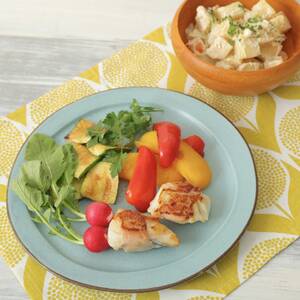 たらの中まで火が通ったら、器に野菜とともに盛りつけ、パセリとラディッシュを添える。