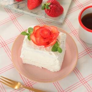 ケーキの一番上にスプーンでクリームをのせ、ケーキ1台に対し、1個分の苺のスライスをさして花の形にする。