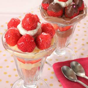 グラスの側面に貼り付ける苺は、なるべく薄く薄切りにすると、きれいに貼り付きます。