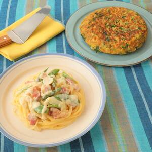 スパゲッティが茹で上がる1分ほど前に、アスパラガス、スナップえんどうを<4>の鍋に入れ、一緒に茹でる。