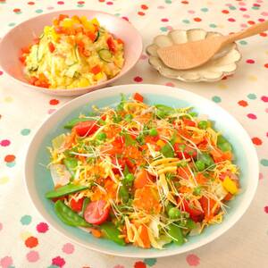 <11>にミニトマト、かいわれ大根、レタス、グリーンピース、絹さやを彩りよく盛りつける。