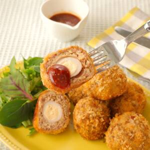 鍋にスコッチエッグが隠れる程度まで油を入れ、中温で5分程度、キツネ色になるまで揚げる。