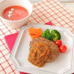 ハンバーグを取り出したフライパンにすりおろした玉ねぎ、りんごを加え、水分を飛ばすように中火で炒める。