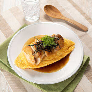 <3>の鶏肉を2等分にし、そぎ切りにしたらオムライスの上に乗せ、煮詰めたタレを少しかける。