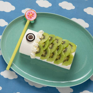 ロールケーキの両端を切り落とし、<15>をうろこに見立てて尾側から並べる。