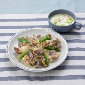 <7>に、水+あさりの出汁、コンソメを加え、煮立たせる。煮立ったらスナップえんどうを加え、さっと火を通す。