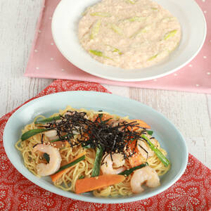 アスパラガスは茎の太い所の皮をピーラーで剥き、斜め薄切りにする。玉ねぎはみじん切りにする。たらこは薄皮からそいでおく。