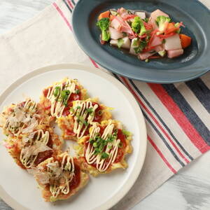 器に盛りつけ、【A】はソース、マヨネーズをぬり、青のり、かつお節をのせる。