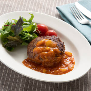 器にハンバーグを盛り付け、ソースをかける。お好みで野菜を添える。