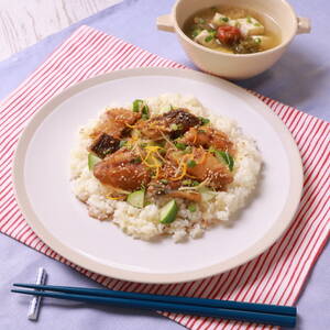 器に酢飯を盛って<5>ときゅうりを並べる。針しょうが、千切りにしたオレンジの皮、いり白ごま、万能ねぎを飾る。
