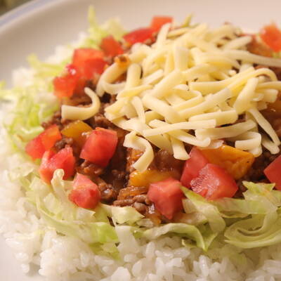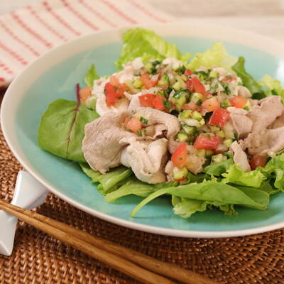 玉ねぎ、しょうが1片をみじん切りにする。レタスは幅1cmの細切りに、トマトは1cm角に刻む。