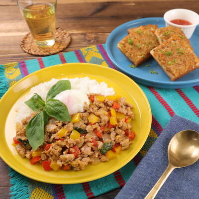 器にご飯を盛り、レタス、<4>、<6>、温泉卵を盛りつける。