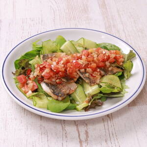 器にきゅうりとベビーリーフを敷き、鯵を盛り付け、ソースをかける。