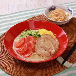 器に茹でた麺を盛り、きゅうり、トマト、錦糸卵、焼豚、紅生姜を乗せる。冷やしておいた【とんこつ風たれ】をかける。