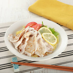 タレの材料を混ぜ合わせる。器に麺を盛り、豚肉、トマト、大葉、レモンを乗せて最後にタレをかける。