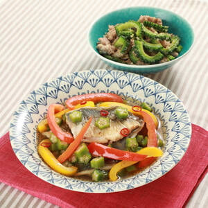 パプリカはそれぞれ1cm幅の細切りにする。オクラは水気をとり5mm幅に切る。