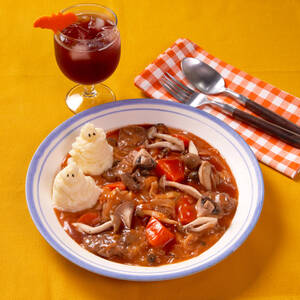 【A】を加えて煮出させたら<5>、にんじんを加えて全体を混ぜ合わせ、水を加えて中火で混ぜながら煮込む。