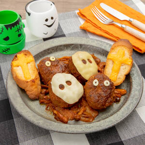煮込んだ<7>に【A】を入れ、よく混ぜてとろみをつける。器に盛り付け、ハンバーグに目とチーズをのせ、バケットを添える。