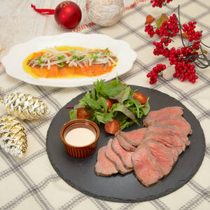 牛肉を常温に戻し、塩、粗びき黒こしょうを全体にふり、なじませる。深めの鍋にお湯を沸かしておく。