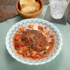 玉ねぎを半分はみじん切りにして小麦粉と混ぜ合わせる。残りの半分、にんじん、じゃがいもは皮をむいて1cm幅の角切りにする。