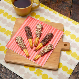 チョコレートを細かく刻み、耐熱ボウルに入れる。湯煎で溶かし、<4>をつける。手早くナッツかチョコスプレーを散らす。