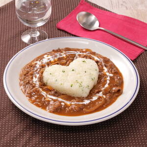 【バタチーライス】の材料をすべて混ぜ合わせ、2等分にする。ハート型に成形して器に盛りつける。