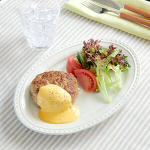 器にハンバーグを盛り付け、上からソースをかけ、ベビーリーフ、トマトを添える。