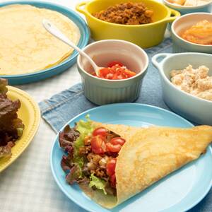 器にクレープを広げ、お好みのトッピングをのせて包む。