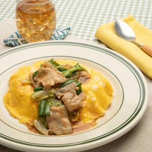 【A】の半量を入れ、菜箸で大きくかき混ぜる。お好みの半熟になったら、<5>の上にのせる。半量も同様に焼いてのせる。
