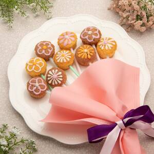 粗熱がとれたらチョコペンで花のイラストを描く。竹串を刺し、束ねる。
