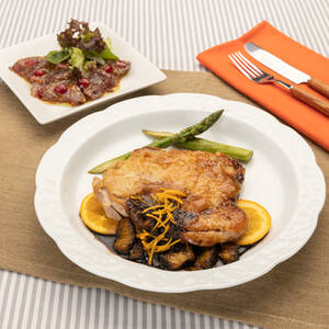 器にアスパラガス、輪切りのオレンジ、食べやすい大きさに切った<10>を盛り付ける。<12>を添え<3>を散らす。