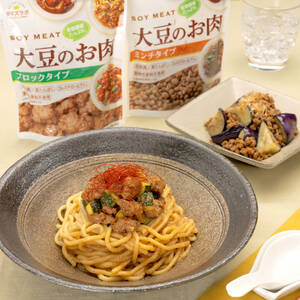 【調理】 フライパンにごま油を引き、中火で加熱 し、大豆のお肉・ズッキーニを入れ、塩を振り炒める。