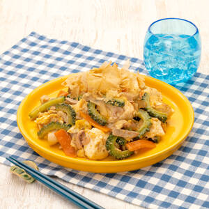 焼き色がついたらにんじんとゴーヤを入れ、全体を混ぜ合わせる。にんじんとゴーヤに火が入るまでしっかりと炒める。