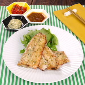 鯵を両面きつね色になるまで揚げ、器にベビーリーフと共に盛り付ける。3種のソースを添える。