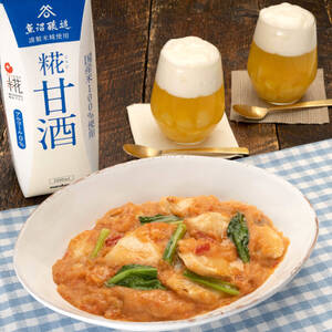 ステンレスのボウルに糀甘酒、牛乳を入れ、熱湯大さじ2で溶いた粉ゼラチン大さじ1/2を加えながら混ぜる。
