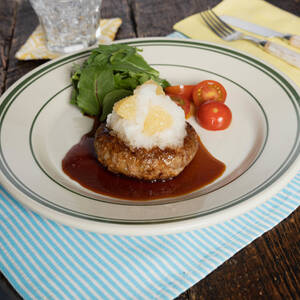 器に<6>を盛りつけ、<9>をのせる。<10>を回しかけ、お好みでベビーリーフとトマトを添える。