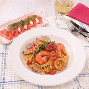 器にトマト、モッツァレラチーズを盛り付ける。<3>をかけ、粗びき黒こしょう、オリーブオイルを回しかけ、大葉を添える。
