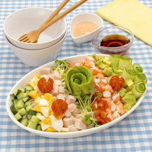【トッピング】 お好きな具材を1cm程度の角切りや大きさに切る。アボカド、ミニトマト、きゅうりなどで花をつくる。