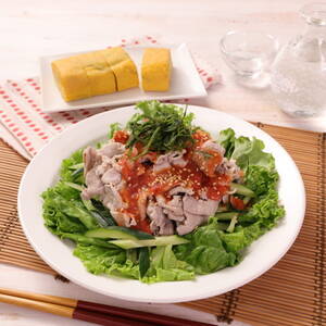 器にグリーンリーフ、きゅうりを盛りつける。<3>に<5>を入れよくからませて盛りつける。残ったタレも回しかける。