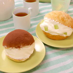 <3>を三等分にして丸め、麺棒で広げる。ロールパンを覆うようにかぶせ、ナイフでメロンパンのような切れ目を入れる。