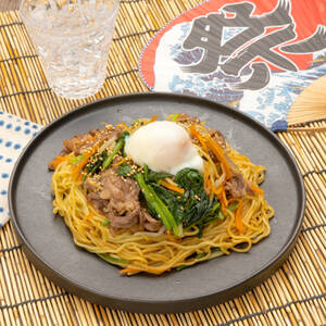 牛肉と【A】をポリ袋に入れ揉み込んでおく。中華麺は袋に切り込みを入れ、電子レンジ600Wで1分加熱する。
